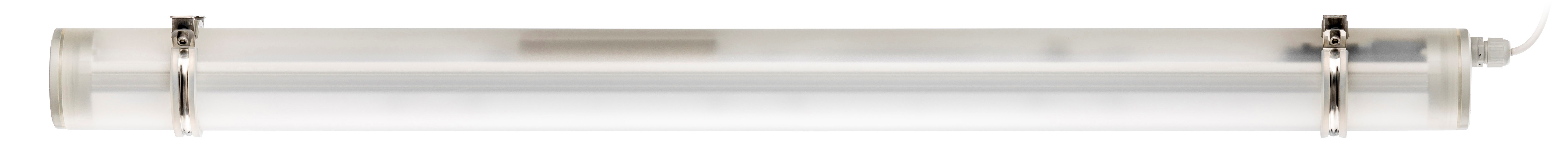 TUBIS LED INDUSTRY DALI 1270mm PO 1x37W 100° 6300lm, 4000K, class I, without TW. Robust round tube luminaire (Ø 90 mm) for demanding industrial environments: impact-resistant, water pressure-tight (IP66/IP68/IPX9K) and versatile mounting options.